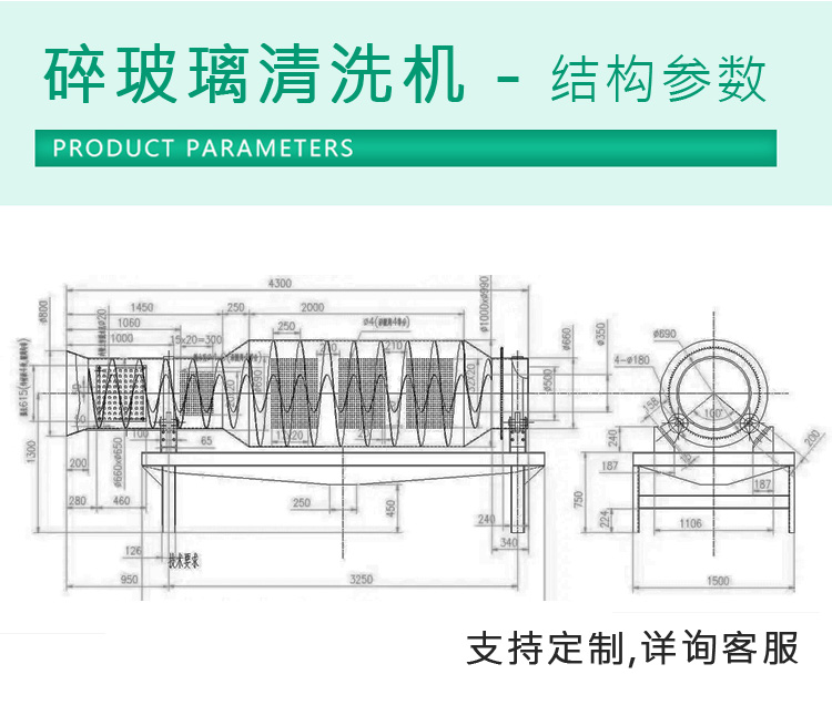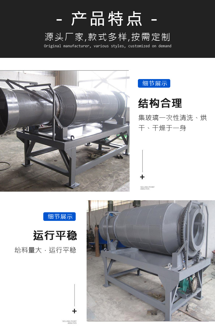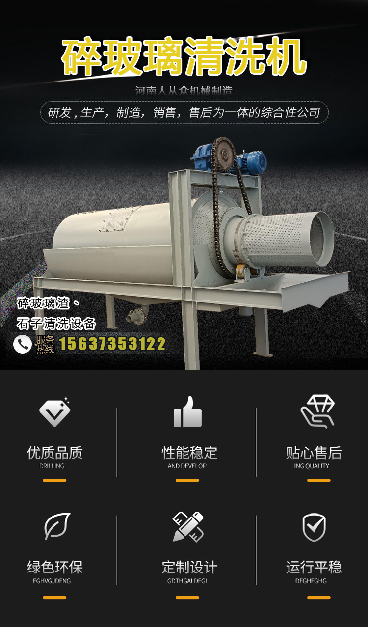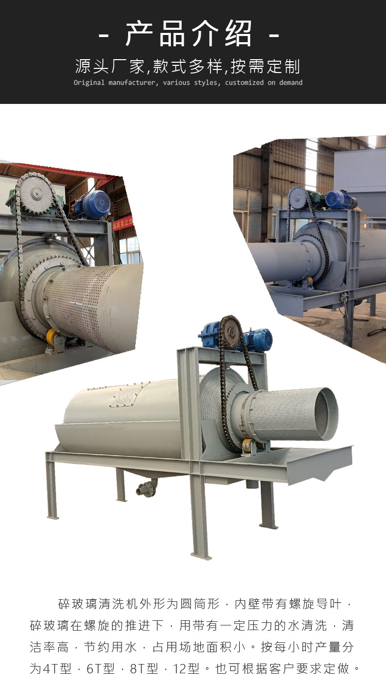 本公司生產的碎玻璃清洗機為圓筒形,可采用水洗,也可干洗,清洗效果都挺好的,按照不同的產量分為多個不同的型號,如4T、6T、8T、12T等型號,也可按需求定制生產。