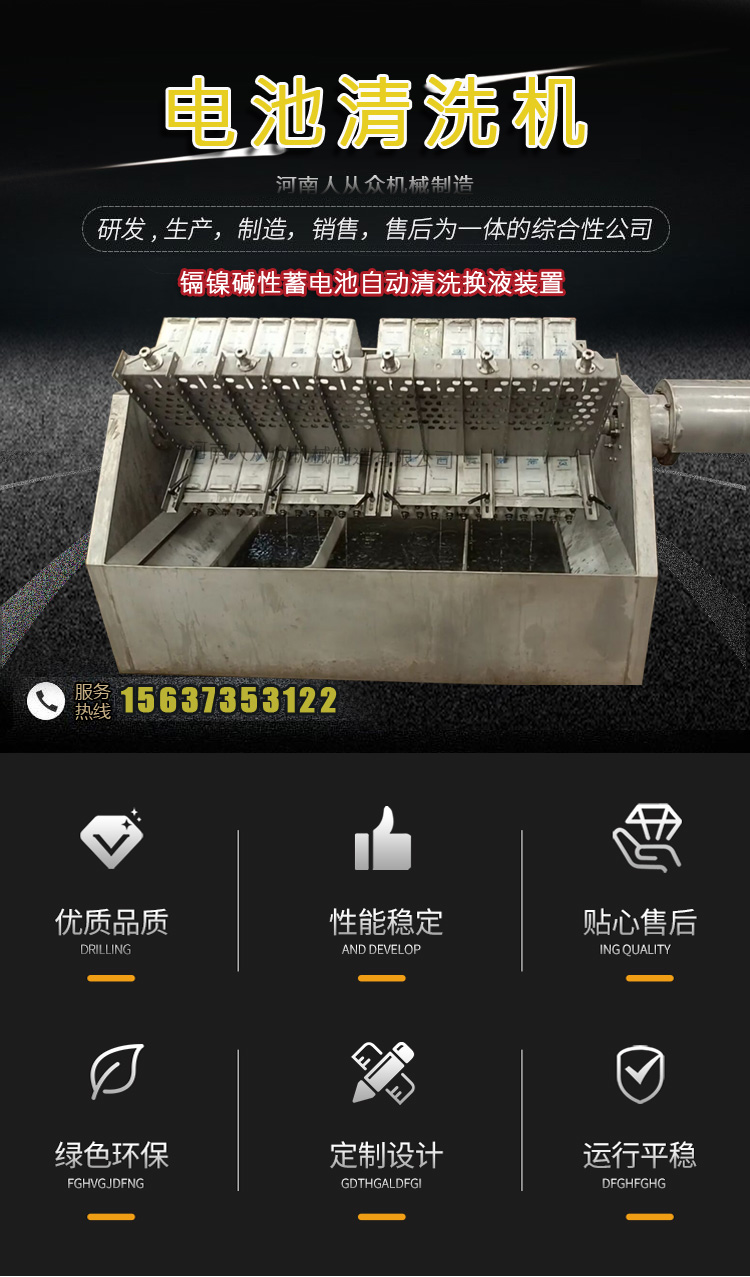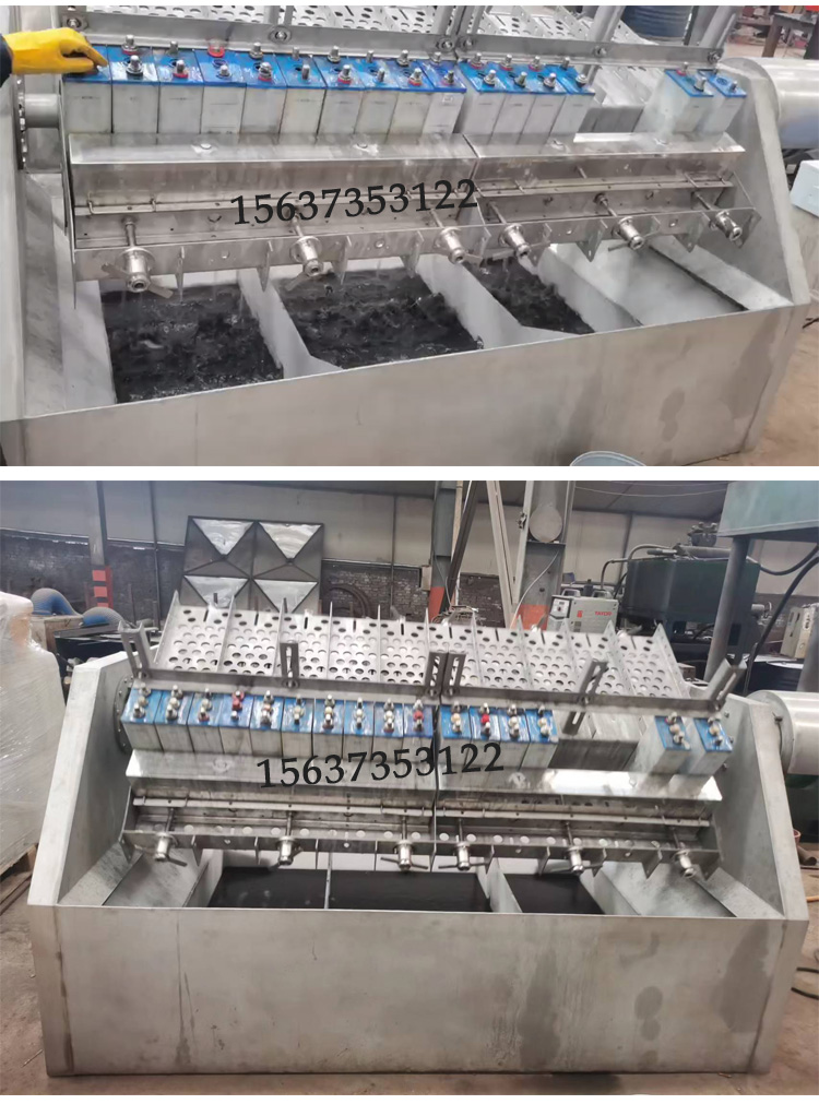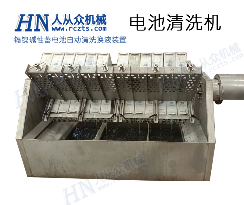 鎘鎳堿性蓄電池清洗換液設備將蓄電池用機械夾緊裝置固定在旋轉槽上,旋轉槽自帶停止制動功能。旋轉槽旋轉時帶動蓄電池360度旋轉,液體在蓄電池內部隨蓄電池的旋轉開始流動,通過控制旋轉速度及旋轉方向來控制在蓄電池內部的流動速度及方向。最后通過控制時間及清洗次數來達到最終干凈效果。對蓄電池的極板無任何損傷,排除了人工清洗的安全隱患。