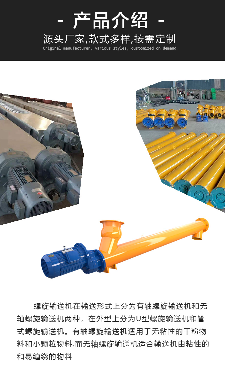 螺旋輸送機(jī)利用螺桿旋轉(zhuǎn)將物料推送到目的的機(jī)器??煞譃檩S向螺旋輸送機(jī)和無軸螺旋輸送機(jī)兩種。從外觀上看,可分為U型螺旋輸送機(jī)和管狀螺旋輸送機(jī)。