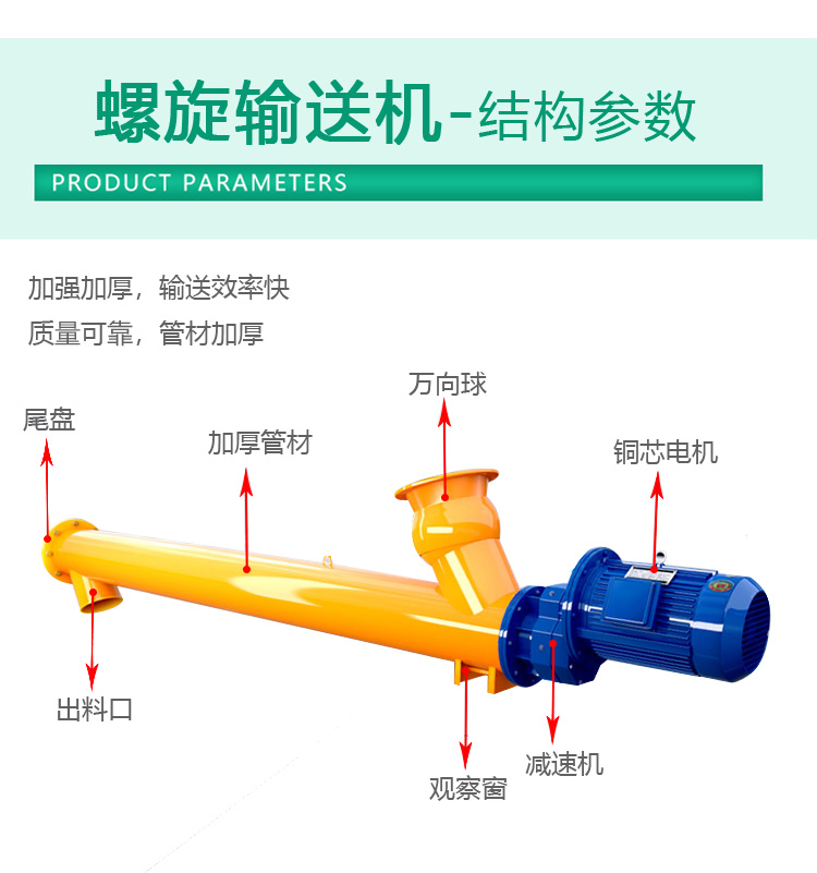螺旋輸送機(jī)利用螺桿旋轉(zhuǎn)將物料推送到目的的機(jī)器。可分為軸向螺旋輸送機(jī)和無軸螺旋輸送機(jī)兩種。從外觀上看,可分為U型螺旋輸送機(jī)和管狀螺旋輸送機(jī)。